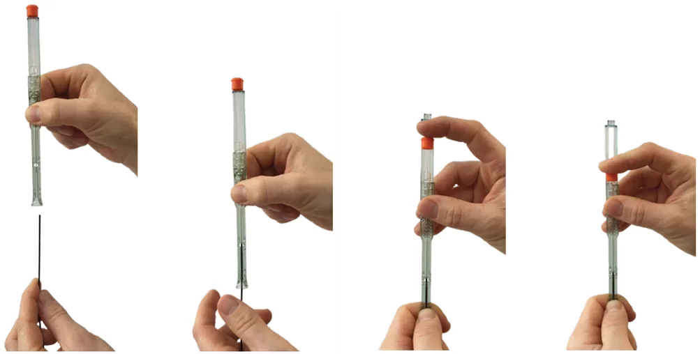 Placement of Gold Anchor through endoscope in central lung, esophagus, pancreas, and rectal tumors is possible by using Gold Anchor Introducer. Gold Anchor Introducer is delivered pre-loaded with the Gold Anchor MR+ (1.5% Fe) marker inside. It comes in a blister single pack, sterilized, ready for use, with the marker length clearly indicated on the package. The Introducer is used to transfer the marker over into a 22G endoscopic ultrasound aspiration needle (“EUS Needle”).